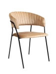 Fotel muszelka VIDAL to styl i wygoda w jednym. Jego ciemnobeżowa welurowa tapicerka jest miękka i elegancka, a czarne metalowe nogi dodają mu nowoczesnego charakteru. Szerokie siedzisko i ergonomiczne oparcie zapewniają wyjątkowy komfort użytkowania.