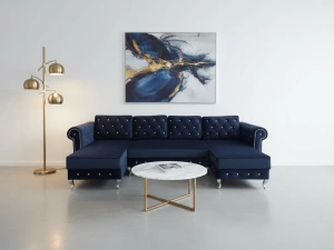 Narożnik NANCY U duży to elegancki i przestronny mebel w stylu glamour, który łączy nowoczesny design z wyjątkową funkcjonalnością. Posiada funkcję spania, aż trzy pojemniki na pościel i pikowane wykończenie, tworząc idealne miejsce relaksu dla całej rodz