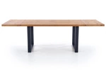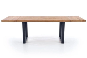 Stół PEREZ to rozkładany stół o eleganckim wyglądzie, wykonany z fornirowanej płyty z obrzeżami z drewna litego. Blat w kolorze jasnego dębu i czarne stalowe nogi tworzą rustykalny, ale nowoczesny design. Blat olejowany wymaga specjalnej konserwacji.