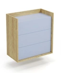 Komoda MOBIUS 3S w kolorze hikora naturalna z frontami w odcieniu niebieskiego horyzontu to stylowy mebel, który łączy funkcjonalność z estetyką. Wykonana z płyty meblowej, zapewnia przestronność i prostotę w aranżacji wnętrz.