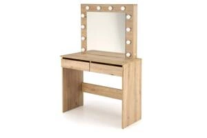 Toaletka HOLLYWOOD w kolorze dąb artisan, wykonana z płyty meblowej okleinowanej, z oświetleniem LED. Posiada duże lustro z żarówkami LED oraz dwie przestronne szuflady z przegródkami. Elegancki i funkcjonalny mebel do sypialni lub salonu kosmetycznego.