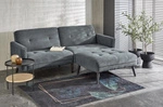 Sofa CORNELIUS w kolorze popielatym to praktyczny mebel z funkcją rozkładania i podnóżkiem tworzącym narożnik. Tapicerowana miękką tkaniną, zapewnia komfort codziennego użytkowania i idealnie komponuje się z nowoczesnymi wnętrzami.