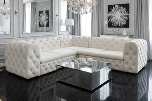 Stylowy narożnik MOMOA 262 × 202 cm w klimacie glamour zachwyca pikowaną tapicerką i elegancką formą. Solidne wykonanie i komfortowe siedzisko sprawiają, że to idealny wybór do nowoczesnych salonów.