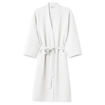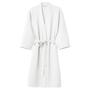 Klasyczny biały szlafrok unisex wykonany w 100% z oddychającej bawełny o strukturze waflowej (gofer). Lekki, wygodny i ponadczasowy – idealny do domu, hotelu czy spa.