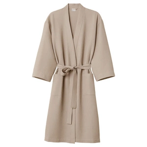 Elegancki szlafrok unisex w subtelnym beżowym odcieniu, wykonany w 100% z naturalnej bawełny o strukturze waflowej (gofer). Lekki, oddychający i komfortowy – idealny do domu, hotelu czy podróży.
