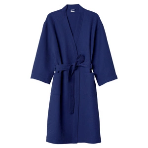 Stylowy i lekki szlafrok unisex w kolorze granatowym, wykonany w 100% z oddychającej bawełny o strukturze gofra. Wyposażony w wiązanie w pasie i kieszenie, zapewnia komfort, przewiewność i elegancki wygląd zarówno kobietom, jak i mężczyznom.