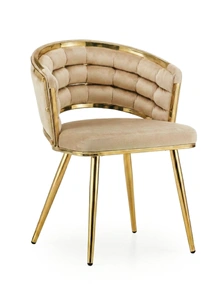 Beżowe krzesło SORENA na złotym stelażu to elegancki akcent w stylu glamour – subtelne, wygodne i stylowe, idealne do jadalni, salonu czy przestrzeni komercyjnej.