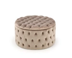 Pikowana Pufa NUNEZ w kolorze beżowym, wykonana z tkaniny velvet i wyposażona w pojemnik na przechowywanie. Ta okrągła pufa jest idealnym dodatkiem do wnętrz w stylu glamour, klasycznym lub nowoczesnym.