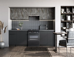 Kuchnia TAMARA 240 o długości 240 cm łączy elegancki popielaty marmur z czarnymi frontami i nowoczesnym korpusem carbon wood. Zestaw wyposażony w podnośniki gazowe oraz blat o grubości 28 mm w kolorze popielu, zapewnia funkcjonalność i estetykę.