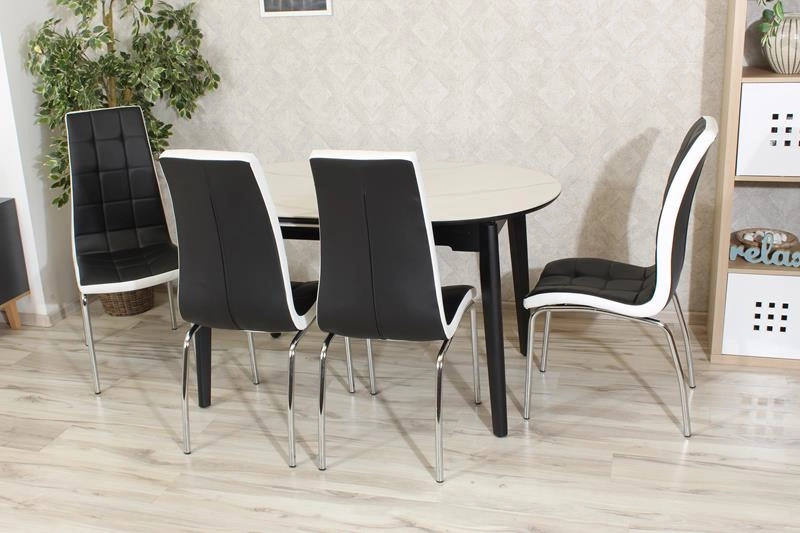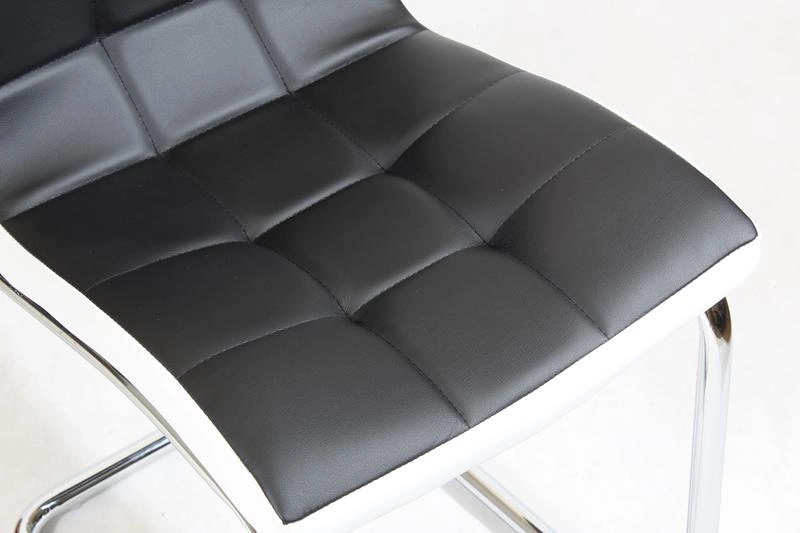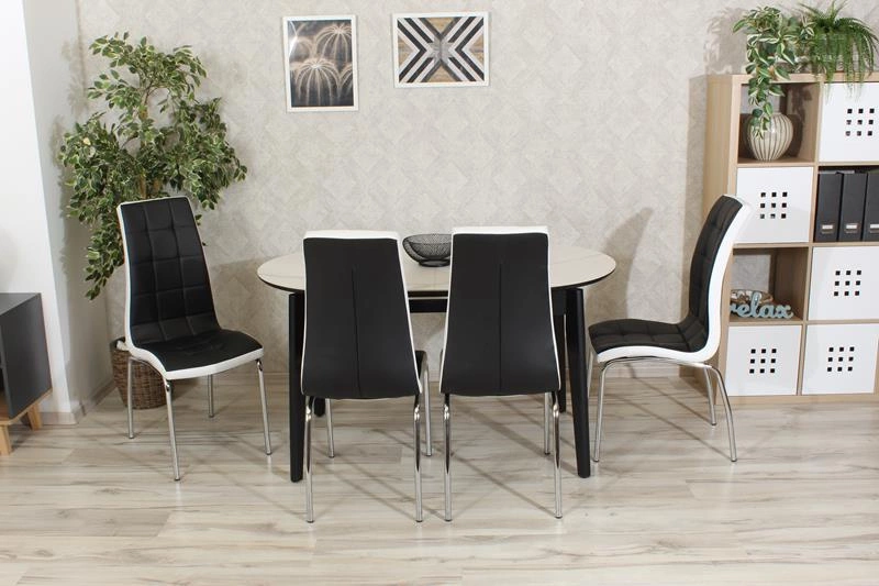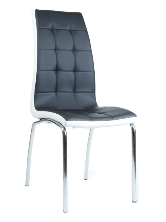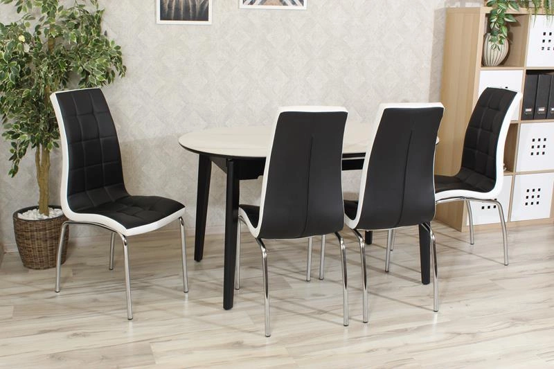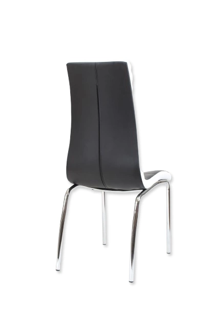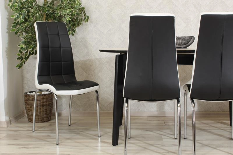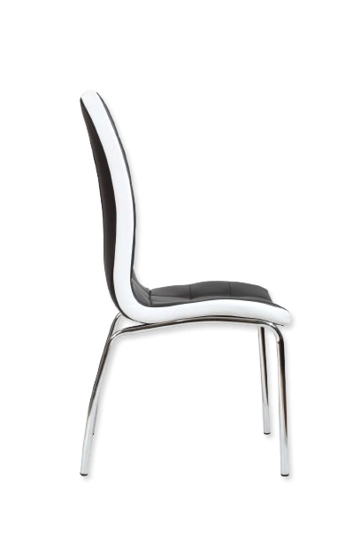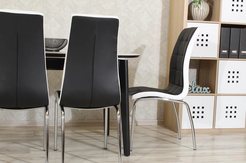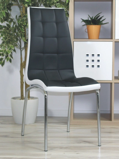 - Eleganckie krzesło CORSO B tapicerowane czarno-białą ekoskórą to idealne połączenie nowoczesnego designu i komfortu. Smukłe, srebrne nogi z chromowanej stali podkreślają jego lekki, a zarazem stylowy charakter.