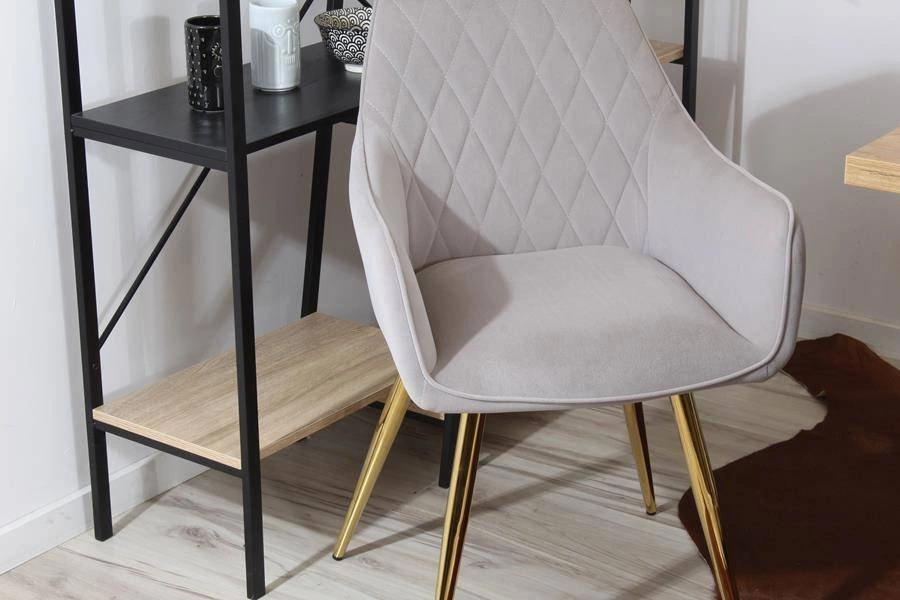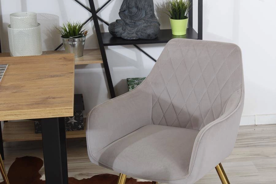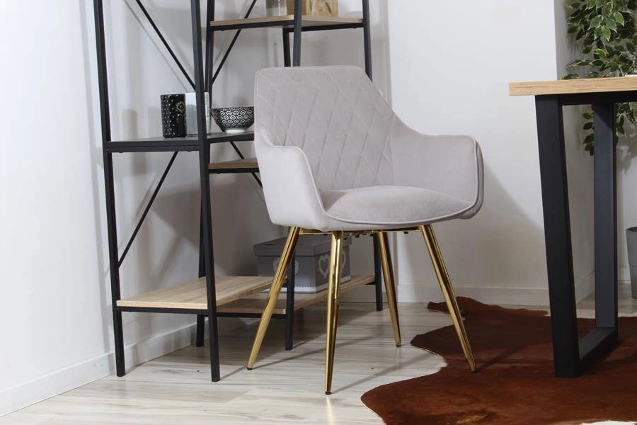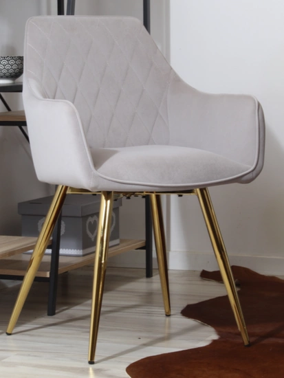 Miękkie siedzisko i zaokrąglone oparcie zintegrowane z podłokietnikami zapewniają komfort nawet podczas długiego siedzenia. Wysokiej jakości welurowa tapicerka jest nie tylko przyjemna w dotyku, ale również odporna na codzienne użytkowanie. Złote, smukłe nogi ze stali chromowanej nadają meblowi subtelnej elegancji, dzięki czemu doskonale wpisuje się on w stylistykę glamour, klasyczną, a także minimalistyczną.
