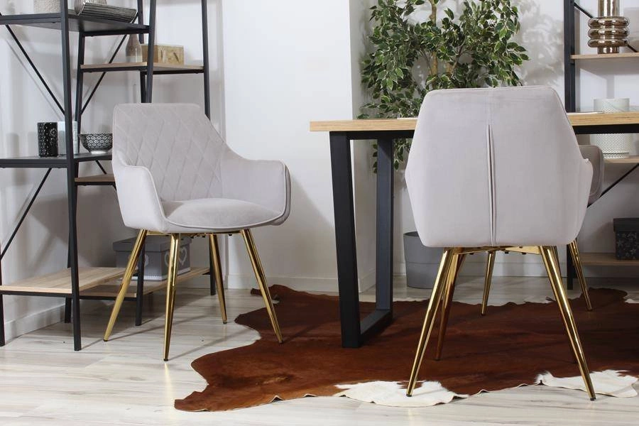 Krzesło CARBO w szarym welurze i na złotych nogach to idealne połączenie klasycznej elegancji z nutą nowoczesnego szyku. Dzięki swojej formie łączy wygodę fotela z funkcjonalnością krzesła, stając się wyjątkowym elementem każdej aranżacji.