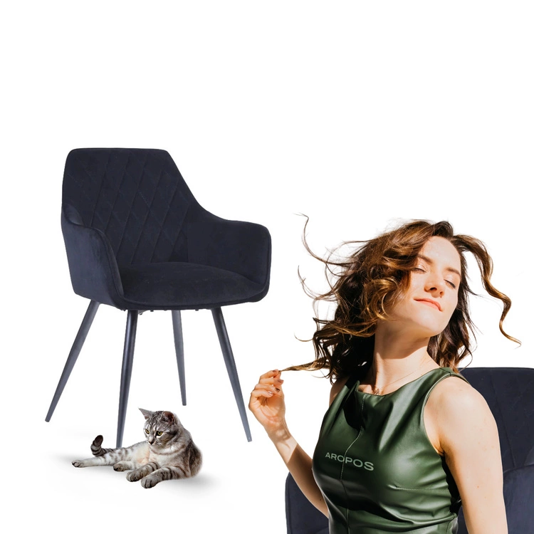 Tapicerowane miękkim welurem siedzisko zapewnia wysoki komfort użytkowania, a ergonomiczne oparcie z podłokietnikami pozwala zrelaksować się podczas dłuższego siedzenia. Charakterystyczne przeszycia w formie rombów na wewnętrznej stronie oparcia dodają mu szyku i oryginalności. Stabilna, metalowa konstrukcja w czarnej kolorystyce nadaje całości spójnego, nowoczesnego charakteru.