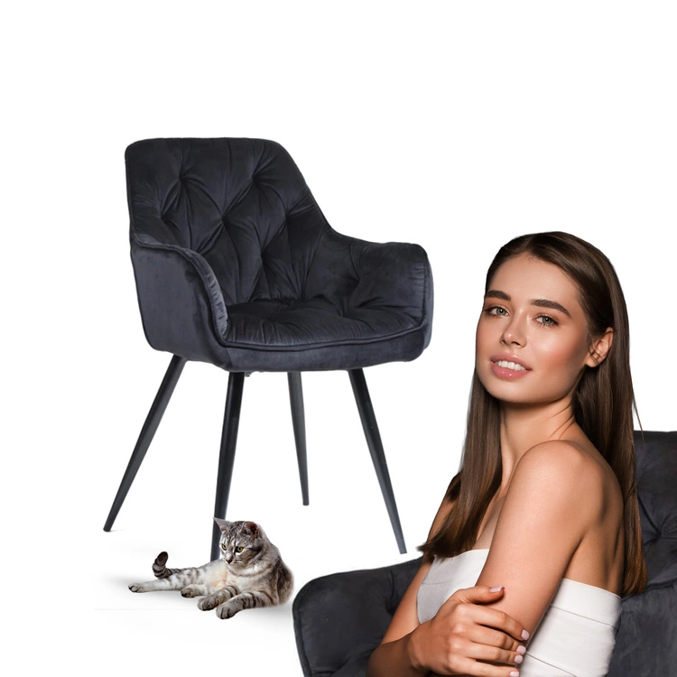 Klasyczna czerń w nowoczesnym wydaniu – krzesło fotelowe AURORA w całości utrzymane w głębokim odcieniu czerni to idealna propozycja do wnętrz loftowych i industrialnych. Miękka tapicerka z weluru o satynowym połysku, charakterystyczne marszczenia oraz stabilna podstawa w tym samym kolorze tworzą projekt, który łączy elegancję z nutą surowości.