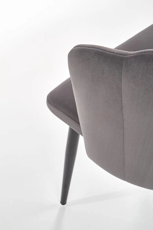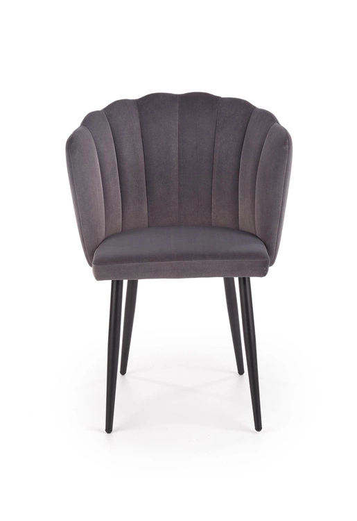 Krzesło K386 to stylowy model typu muszelka, który wyróżnia się elegancją i wygodą. Dzięki miękkiej tapicerce z tkaniny velvet w popielatym odcieniu oraz smukłym, stabilnym nogom ze stali malowanej proszkowo, prezentuje się niezwykle efektownie. Wyprofilowane oparcie w formie muszli otula sylwetkę, zapewniając komfort podczas siedzenia, a jednocześnie nadaje wnętrzu modny, glamour charakter. Krzesło świetnie sprawdzi się w jadalni, salonie czy sypialni przy toaletce, wprowadzając nutę nowoczesnej elegancji.