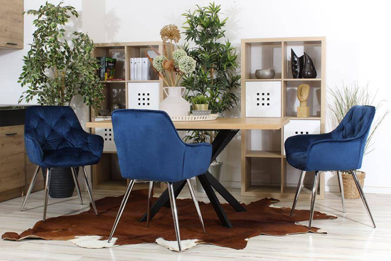 Krzesło fotelowe AURORA w odcieniu głębokiego granatu łączy w sobie wygodę fotela i stabilność klasycznego krzesła. Jego miękka, satynowa tapicerka welurowa o zwiększonej odporności na ścieranie została wykończona eleganckimi pikowaniami, które podkreślają luksusowy styl projektu. Zintegrowane podłokietniki oraz odpowiednio wyprofilowane oparcie zapewniają komfort nawet podczas długiego siedzenia. Smukłe, chromowane nogi w srebrnym kolorze dodają konstrukcji lekkości i nowoczesnego wyglądu, tworząc harmonijne połączenie z granatową tapicerką. Model AURORA to doskonały wybór do jadalni, salonu, gabinetu czy przestrzeni biurowych, w których liczy się zarówno estetyka, jak i wygoda.