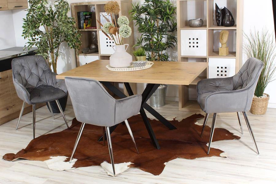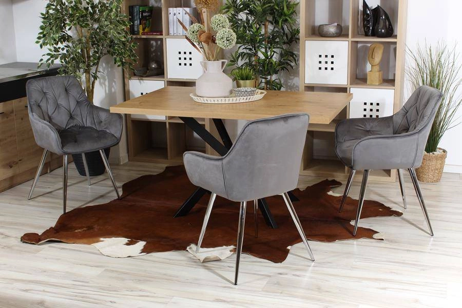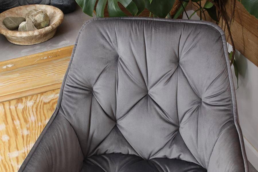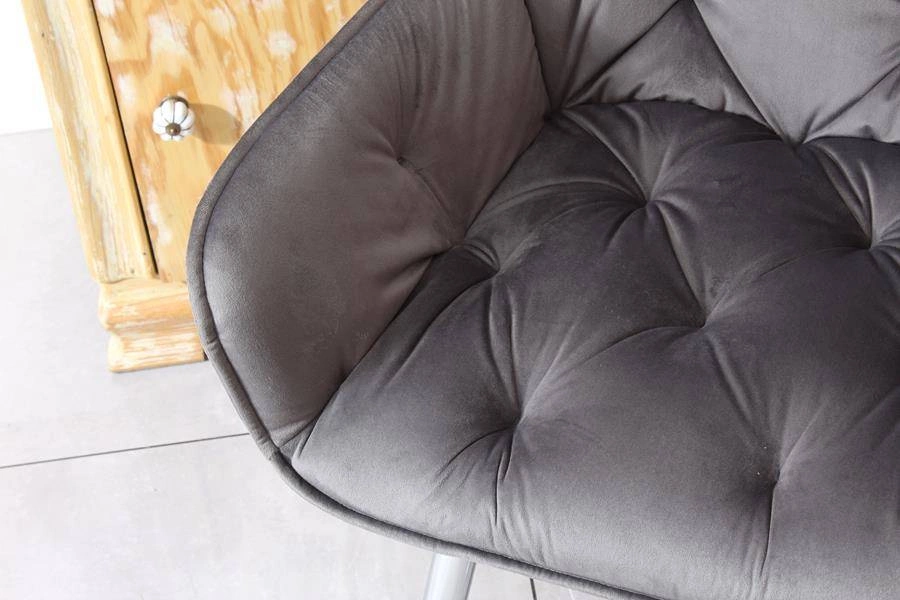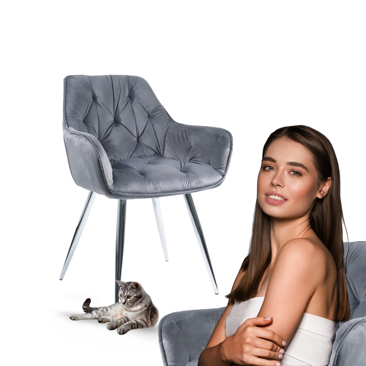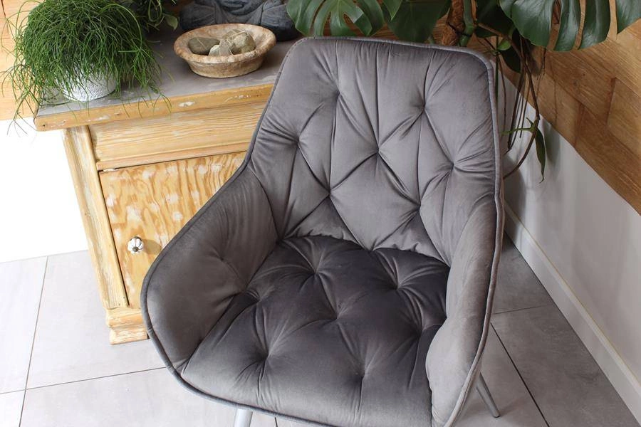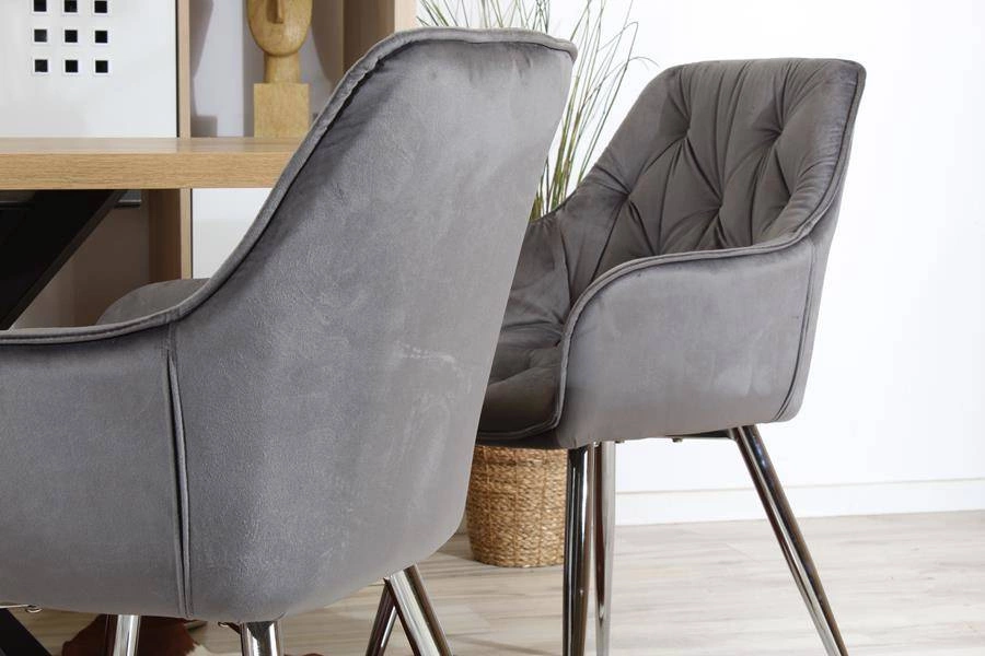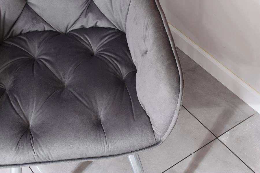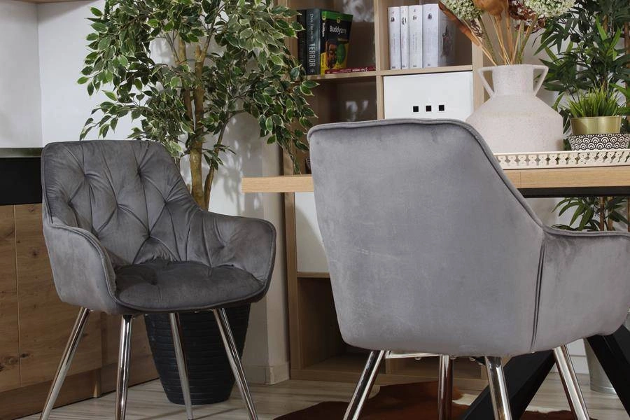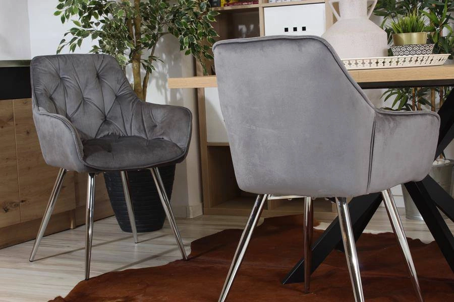 Krzesło fotelowe AURORA w odcieniu szarości to idealne połączenie ponadczasowego stylu z nutą współczesnej elegancji. Obszyte miękkim welurem o satynowym połysku, jest nie tylko przyjemne w dotyku, ale także odporne na przecieranie i plamy, co zapewnia długotrwałą estetykę. Charakterystyczne pikowania nadają tapicerce wyjątkowego szyku, a wygodne, wyprofilowane oparcie z podłokietnikami gwarantuje komfort nawet podczas długiego siedzenia. Całość wspiera stabilna konstrukcja oparta na smukłych nogach z chromowanej stali w srebrnym wykończeniu, co dodaje projektowi lekkości i nowoczesności. Dzięki uniwersalnej kolorystyce i eleganckiej formie krzesło AURORA doskonale odnajdzie się zarówno w jadalni, jak i salonie, gabinecie czy biurze.