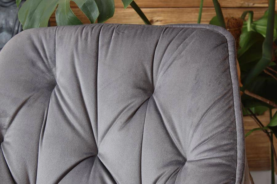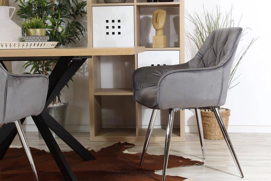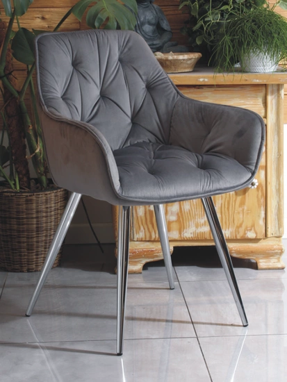 Krzesło fotelowe z podłokietnikami AURORA | szary welur, chromowane nogi, pikowana tapicerka