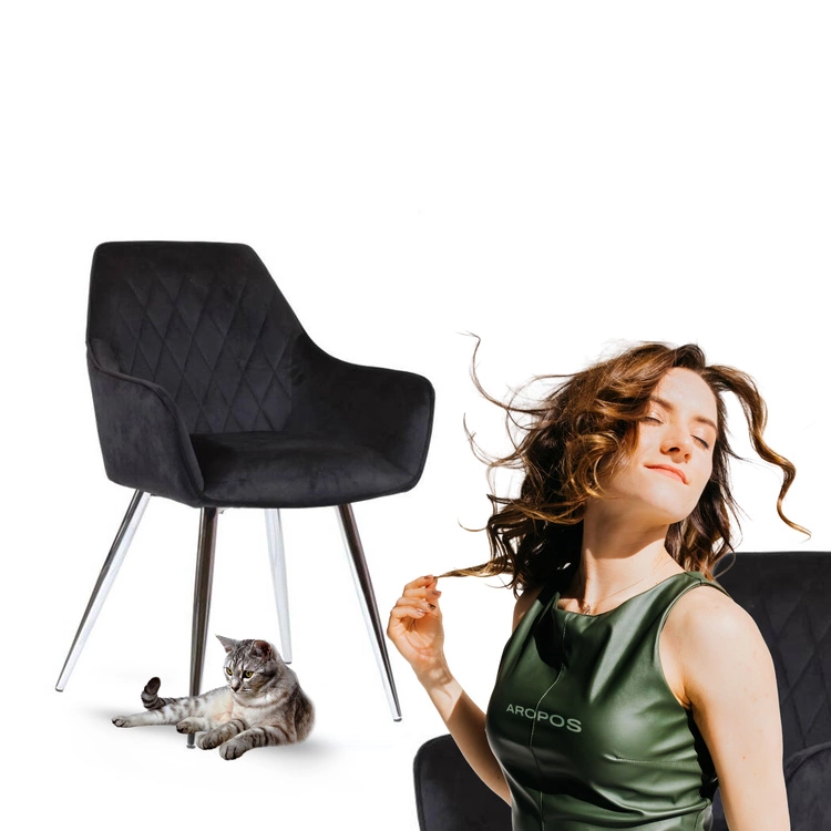 Siedzisko w całości obszyte zostało stylową tkaniną welurową w czarnym kolorze, podstawa natomiast wykonana została ze stali chromowanej w kolorze srebrnym. Ta uniwersalna kolorystyka z pewnością wpasuje się w wystrój każdego wnętrza. Wewnętrzna część oparcia, posiada piękne przeszycia w kształcie rombów, co zdecydowanie podnosi jego walory estetyczne. Dzięki nim w sposób bardzo elegancki uwydatnione są walory tkaniny jaką jest welur. Na uwagę zasługuje również odpowiednio wyprofilowane siedzisko, oraz miękkie i wygodne podłokietniki. Cała konstrukcja krzesła daje gwarancję wypoczynku na najwyższym poziomie.