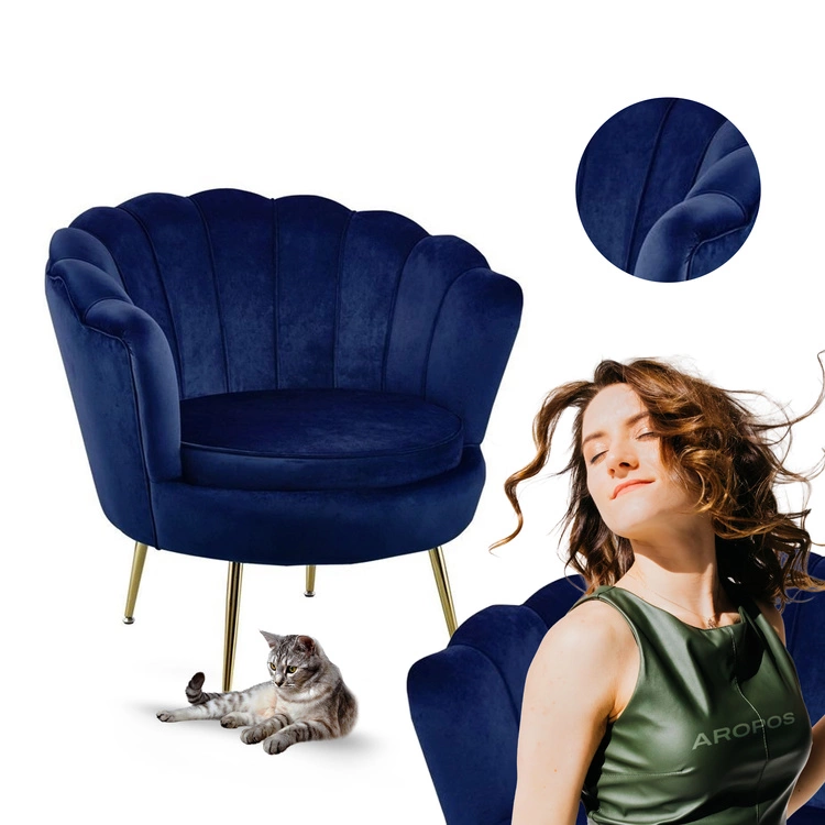 Welurowy fotel muszelka VIDAL | granatowa tapicerka, złote nóżki