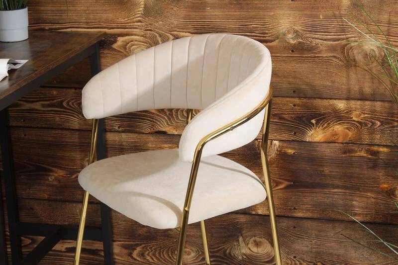 Złoty, chromowany stelaż dodaje całości luksusowego akcentu i idealnie kontrastuje z beżowym obiciem, tworząc harmonijną i stylową kompozycję. Solidna konstrukcja gwarantuje stabilność, a odpowiednio wyprofilowane siedzisko zapewnia komfort nawet podczas dłuższego użytkowania.