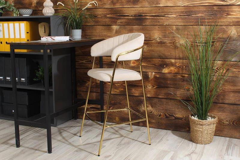 Krzesło barowe MARGO to mebel, który łączy w sobie ponadczasową elegancję, funkcjonalność i wygodę. Tapicerowane siedzisko wykonane z miękkiego weluru w stonowanym beżowym odcieniu emanuje subtelnym urokiem, wprowadzając do wnętrza przytulny i wyrafinowany charakter. Dzięki swojej odporności na zużycie i łatwości w pielęgnacji tkanina zachowa piękny wygląd przez długie lata.