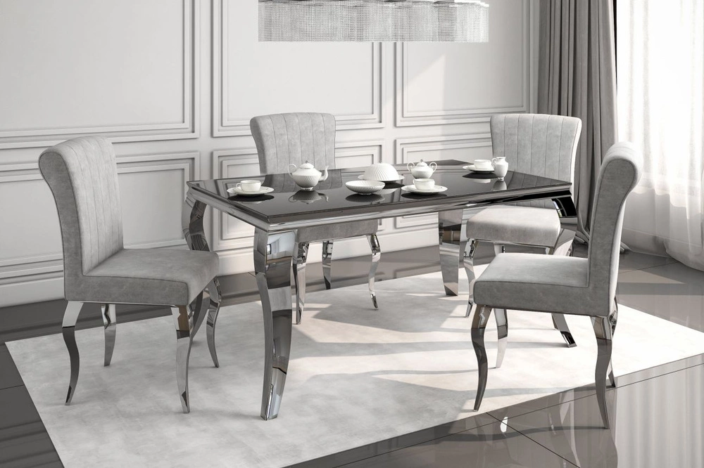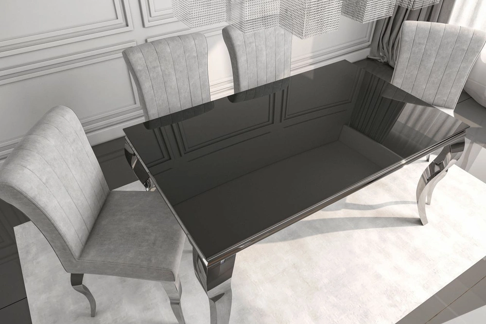 - Stół glamour VENLO łączy czarny blat z hartowanego szkła ze srebrnym stelażem w chromie. Elegancki design o wymiarach 150x90 cm sprawia, że mebel doskonale pasuje do nowoczesnych wnętrz w stylu glamour i modern.