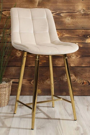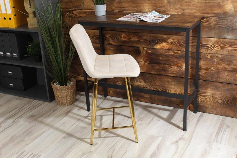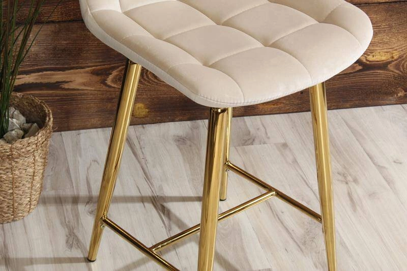 Welurowe krzesło barowe niskie PROXI pikowane jasny beż na złotych nogach