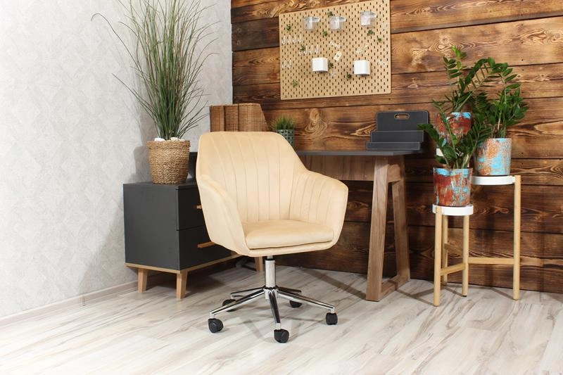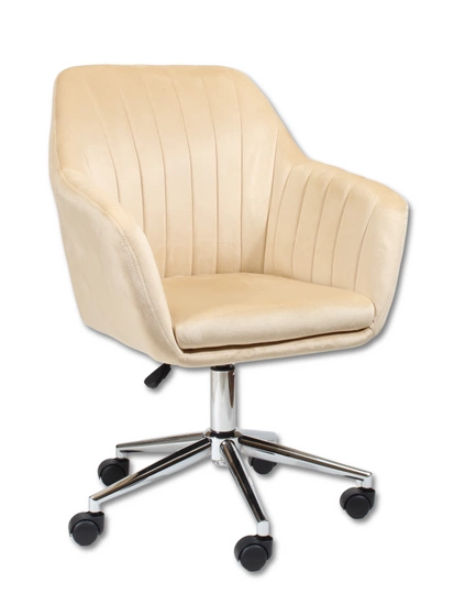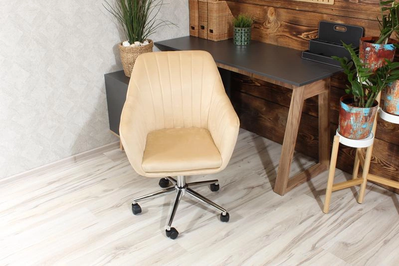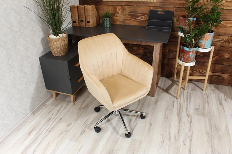 Wygodny fotel z weluru do biurka FABIO beżowy ze srebrną podstawą