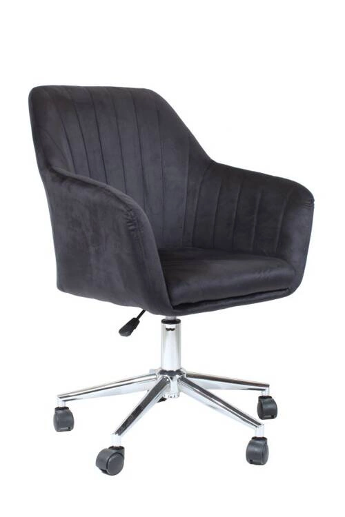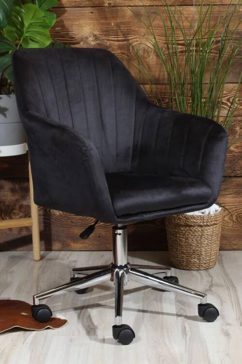 Fotel biurowy obrotowy FABIO to połączenie luksusu i wygody. Jego welurowe, czarne siedzisko nie tylko prezentuje się elegancko, ale także zapewnia niezrównany komfort. Z pionowymi przeszyciami na oparciu, podłokietnikami i chromowanym stelażem w kolorze srebrnym na kółkach, FABIO to nie tylko praktyczny mebel biurowy, ale również wyrafinowany element aranżacji przestrzeni roboczej. Fotel biurowy obrotowy FABIO to wyraz komfortu i ekskluzywnego designu, który podnosi estetykę każdego biura. Czarne, welurowe siedzisko nie tylko zachwyca swoją elegancją, ale także zapewnia miękką wygodę podczas długotrwałego siedzenia. Pionowe przeszycia na oparciu nadają fotelowi subtelny charakter, tworząc unikalny wygląd. Dodatkowe podłokietniki zwiększają wygodę użytkowania, dostarczając wsparcia dla ramion. Chromowany stelaż w kolorze srebrnym, oparty na kółkach, nie tylko dodaje fotelowi nowoczesnego charakteru, ale także umożliwia łatwe przemieszczanie się po przestrzeni biurowej. FABIO to nie tylko funkcjonalny mebel biurowy, to również designerski akcent, który wnosi elegancję i prestiż do miejsca pracy. Jego czarne welurowe siedzisko doskonale komponuje się z pionowymi przeszyciami i chromowanym stelażem, tworząc fotel, który jest nie tylko narzędziem do pracy, ale także elementem dekoracyjnym. To połączenie luksusu, funkcjonalności i estetyki, które sprawia, że praca staje się nie tylko efektywna, ale także przyjemna.
