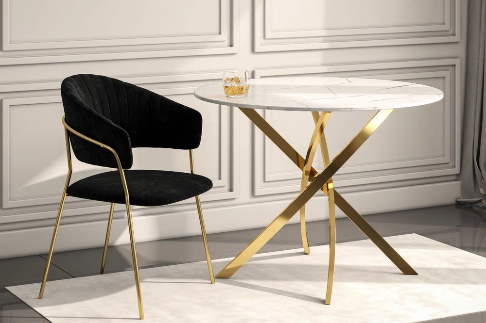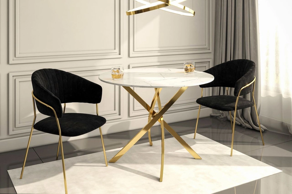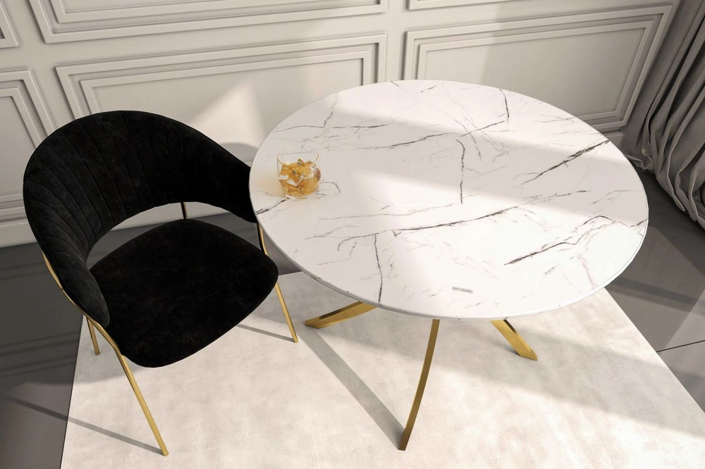 • Stół okrągły TAURUS to harmonia elegancji i nowoczesnego designu. Jego blat nadaje pomieszczeniu wyjątkowego uroku, tworząc atmosferę luksusu i stylu. Nogi w kolorze złotym dodają mu szyku i wyrafinowania, stanowiąc idealne dopełnienie każdej przestrzeni.