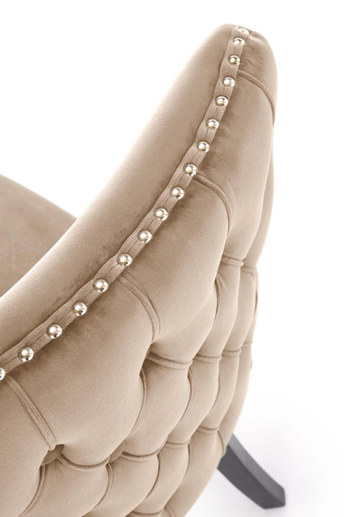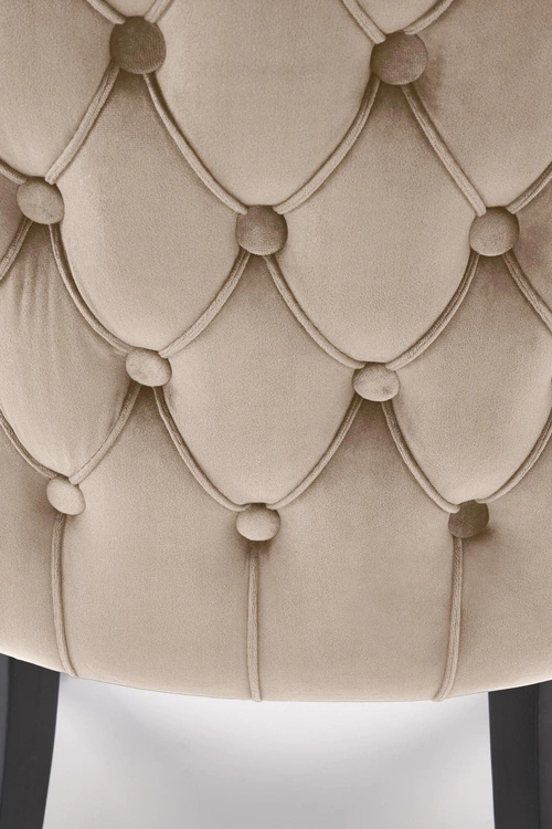 Siedzisko i oparcie krzesła są tapicerowane miękką tkaniną velvet w eleganckim beżowym kolorze, która zapewnia nie tylko wyjątkowy komfort, ale także dodaje wnętrzu ciepła i przytulności. Tył oparcia ozdobiony jest guzikami, tworząc efektowne pikowanie, co podkreśla klasyczny charakter mebla. Dodatkowo, subtelne nity zdobiące krawędzie siedziska oraz oparcia, nadają krzesłu wyjątkowego charakteru i elegancji.
