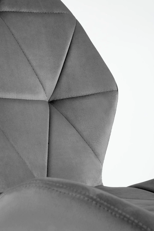 Oparcie zostało zaprojektowane z geometrycznym wzorem pikowania, co dodaje krzesłu oryginalnego charakteru i nowoczesnego stylu. Krzesło jest wsparte na stabilnych, smukłych nogach wykonanych ze stali malowanej proszkowo na czarny kolor. Taka konstrukcja zapewnia trwałość, wytrzymałość oraz stabilność, a zarazem dodaje krzesłu lekkości wizualnej.