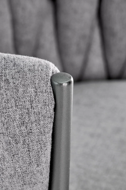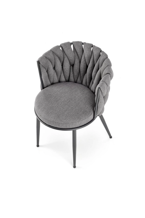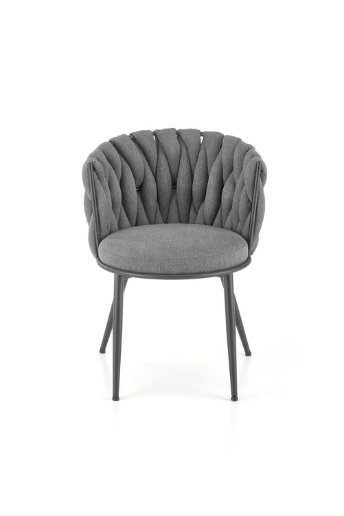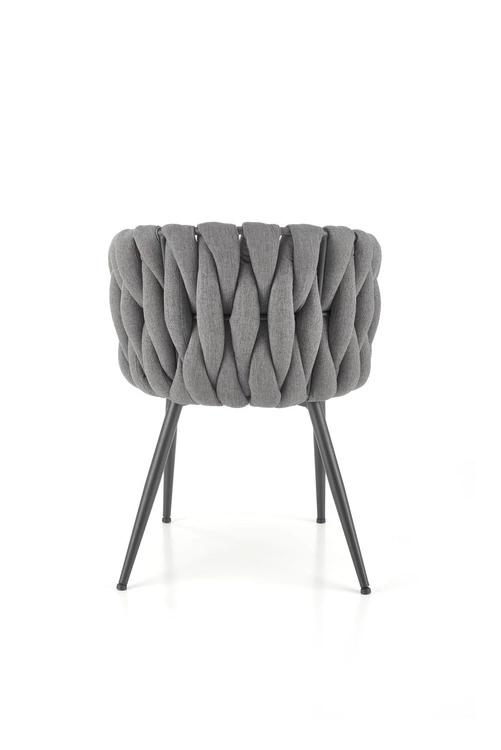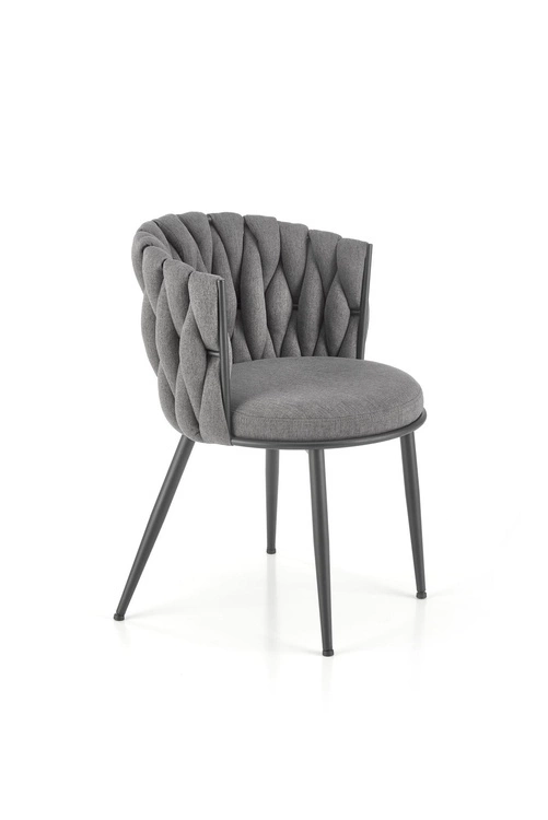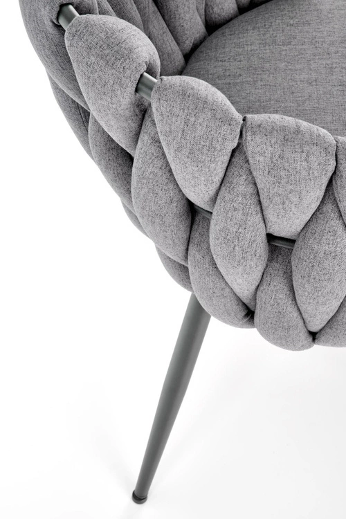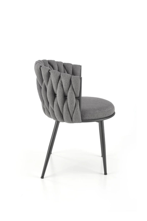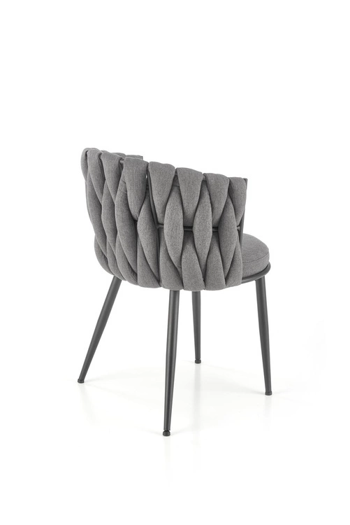 Krzesło K516 wyróżnia się tapicerowanym oparciem i siedziskiem, wykonanymi z wysokiej jakości tkaniny NEA w kolorze popielatym. Unikalny design oparcia, przypominający plecionkę, nadaje meblowi niepowtarzalny charakter. Dzięki solidnej, stalowej ramie malowanej proszkowo, krzesło jest nie tylko estetyczne, ale również trwałe i stabilne.