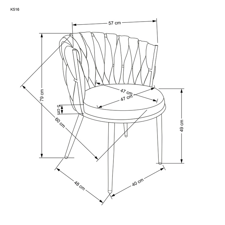 Wymiary krzesła to 57 cm szerokości, 60 cm głębokości, 79 cm wysokości oraz 49 cm wysokości siedziska, co sprawia, że jest idealnie dopasowane do różnych typów stołów. Krzesło K516 to doskonały wybór dla tych, którzy cenią sobie elegancję połączoną z komfortem.