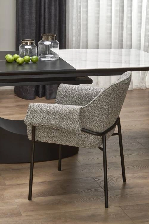 Stół OSMAN wyróżnia się eleganckim blatem wykonanym z ceramiki w kolorze białego marmuru, który jest nie tylko stylowy, ale również odporny na zarysowania i łatwy w utrzymaniu czystości. Solidna noga w kolorze czarnym, wykonana z MDF lakierowanego i stali malowanej proszkowo, zapewnia stabilność i wyjątkowy wygląd.