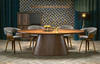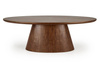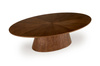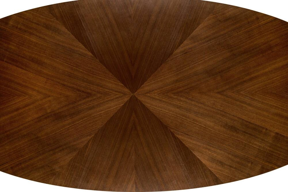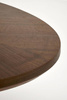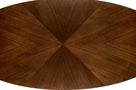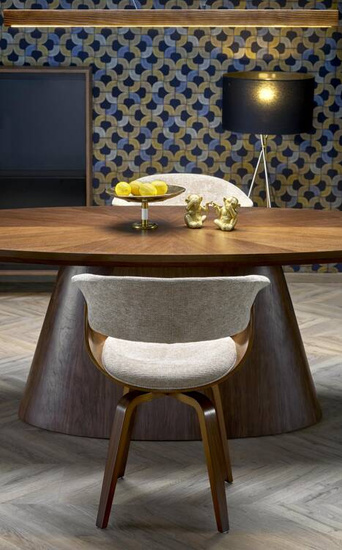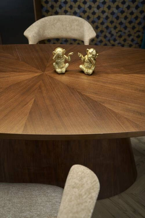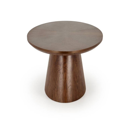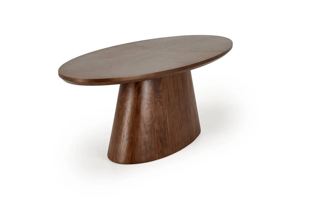 Blat stołu VAGNER charakteryzuje się unikalnym wzorem, który przyciąga wzrok i nadaje meblowi wyjątkowego charakteru. Naturalna okleina w kolorze orzechowym doskonale komponuje się z ciepłym, drewnianym odcieniem, który dodaje wnętrzu przytulności i harmonii. Solidna podstawa stołu w formie szerokiego, stożkowatego postumentu zapewnia stabilność oraz podkreśla nowoczesny styl mebla.