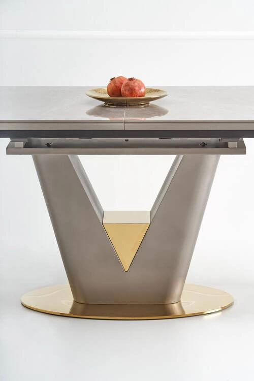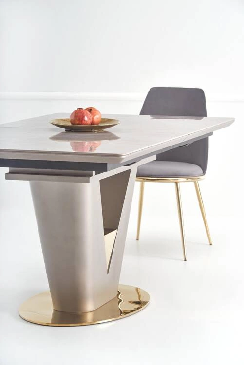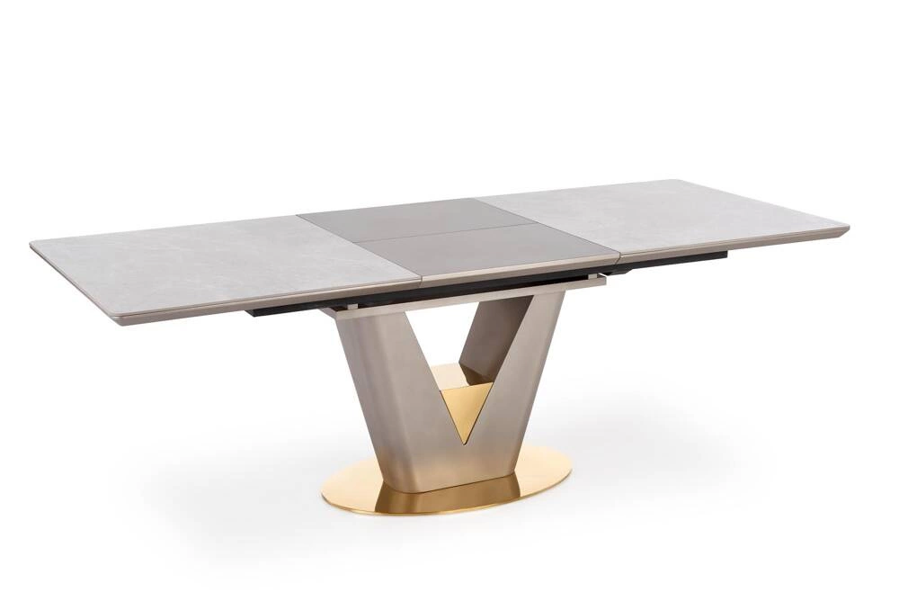 - Rozkładany stół VALENTINO z popielatym marmurowym blatem i nogą w wykończeniu jasny popiel ze złotem. Idealny do salonu czy jadalni, ten elegancki stół wprowadzi do Twojego wnętrza nutę luksusu i klasy.