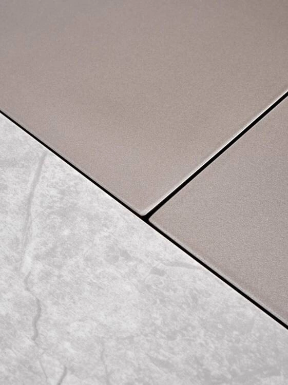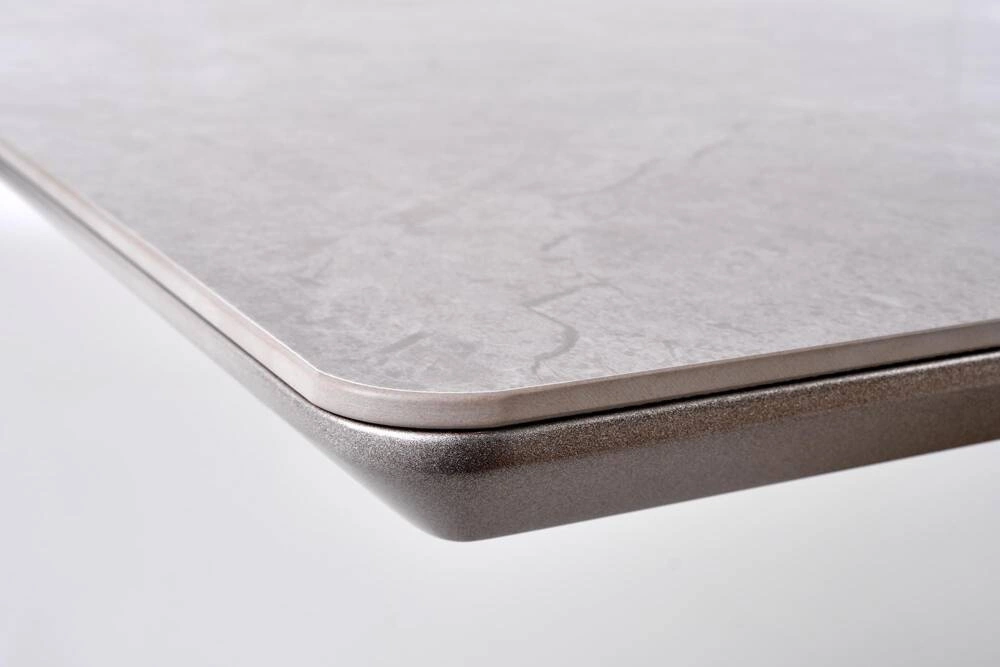 Stół VALENTINO wyróżnia się blatem w kolorze jasnego popielatego marmuru, który dodaje wnętrzu subtelnej elegancji. Blat wykonany jest z ceramiki, co zapewnia trwałość i łatwość w utrzymaniu czystości. Stabilność i nowoczesny wygląd zapewnia noga stołu, wykonana z lakierowanego MDF oraz chromowanej stali w kolorze jasnego popielu i złota. Te materiały nadają stołowi wyjątkowy charakter, łącząc trwałość z estetyką.
