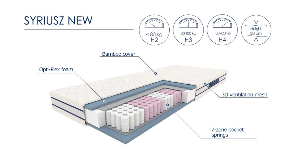 - Materac SYRIUSZ 90x200 cm to doskonałe wsparcie dla kręgosłupa, zapewniające wygodny sen. Jego elastyczna konstrukcja dopasowuje się do kształtu ciała, oferując komfort i relaks. Idealny do łóżek jednoosobowych.