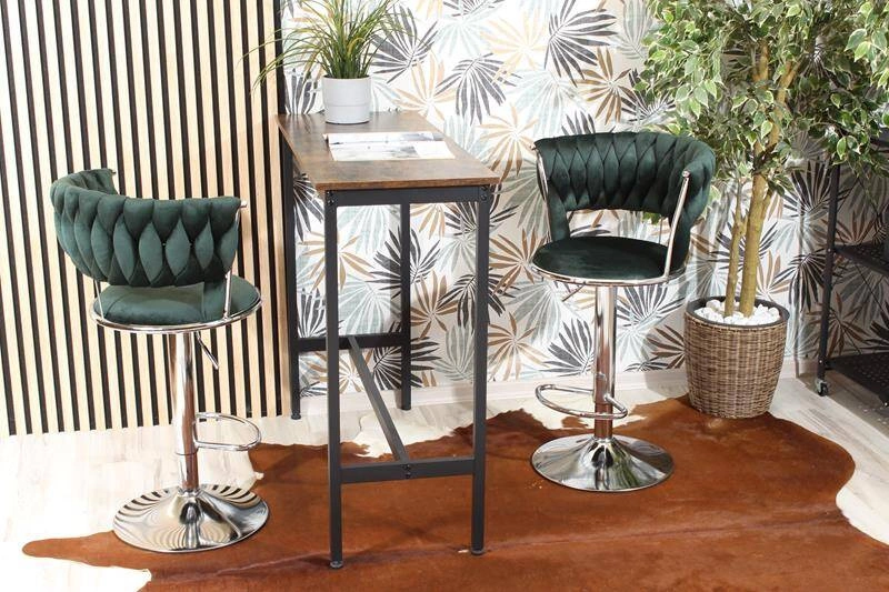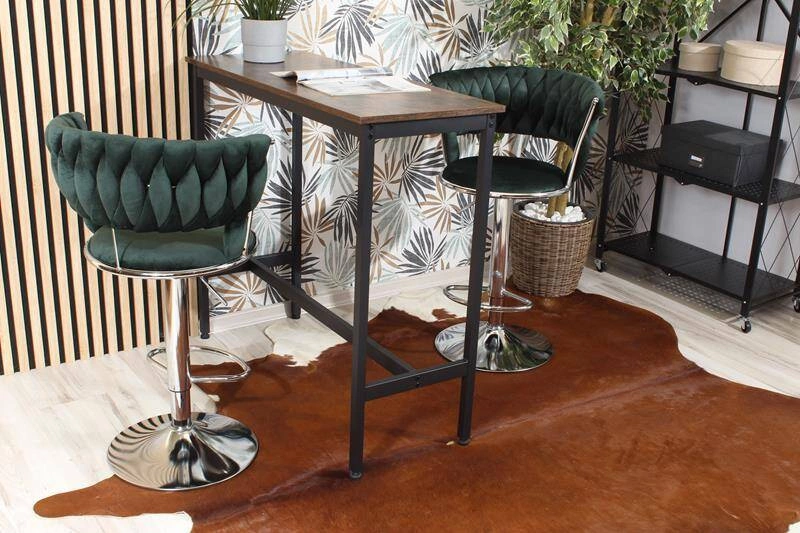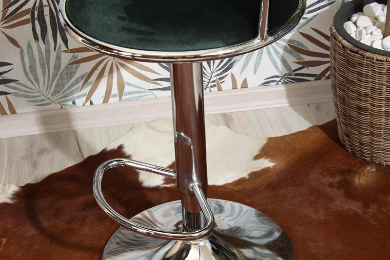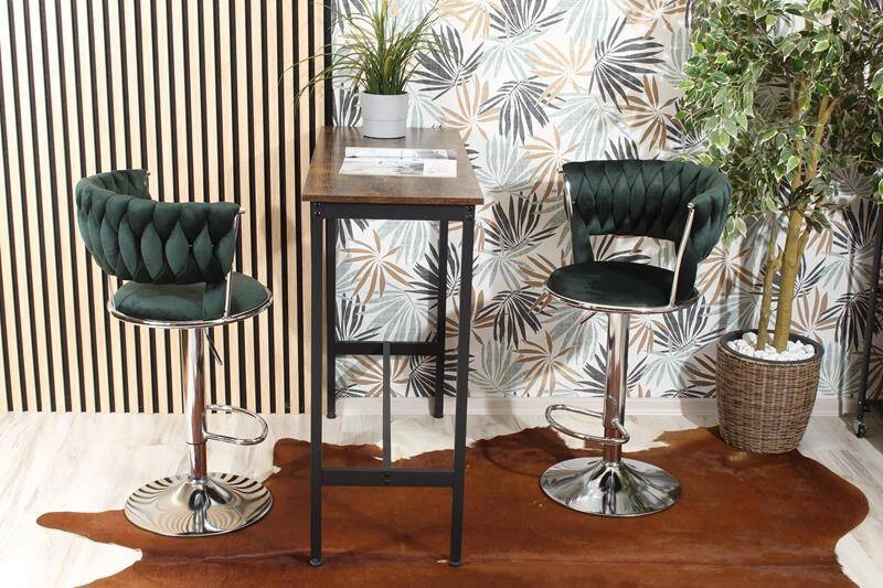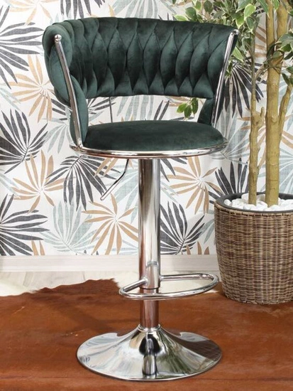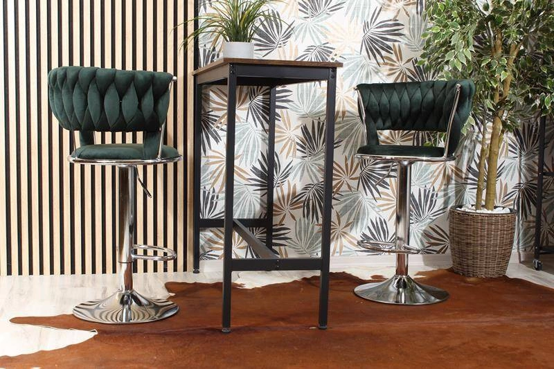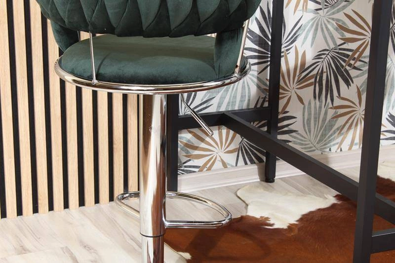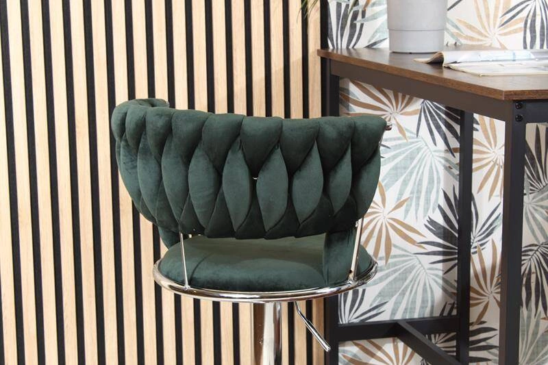 - Obrotowy hoker ROSA 1 z welurowym siedziskiem i plecionym oparciem w kolorze zielonym. Srebrny stelaż i noga dodają elegancji. Posiada regulację wysokości dla większej funkcjonalności. Idealny do nowoczesnych wnętrz, łączący luksusowy design z komfortem.