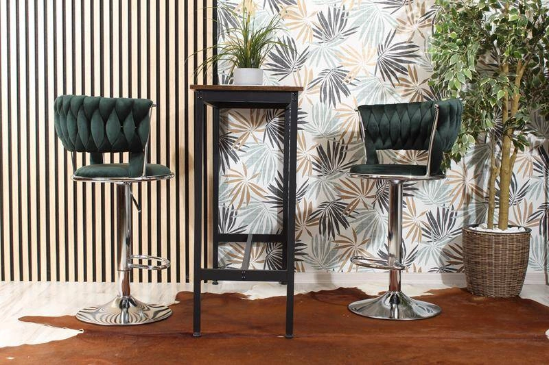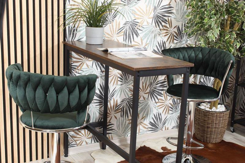Obrotowy hoker ROSA 1 to harmonijne połączenie luksusu i funkcjonalności, które idealnie wpasuje się w nowoczesne wnętrza. Siedzisko i oparcie wykonane z wysokiej jakości weluru w głębokim zielonym kolorze oferują wyjątkowy komfort siedzenia. Oparcie jest ozdobione efektowną plecionką, która dodaje hokerowi unikalnego charakteru i stylu.