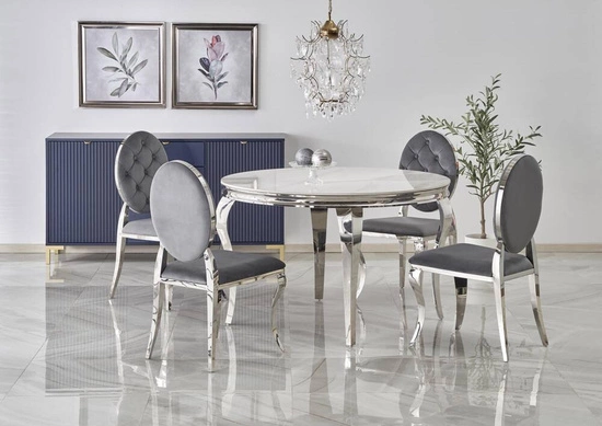 - Elegancki zestaw jadalniany REGINALD z czterema krzesłami K555 to połączenie luksusu i nowoczesności. Biały marmurowy blat i srebrne nogi stołu idealnie komponują się z popielatym welurem krzeseł, tworząc stylową i wyrafinowaną całość.