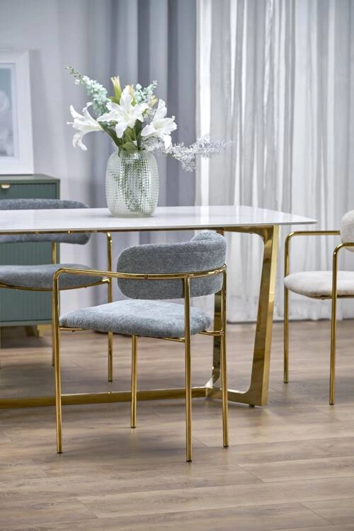 Stół CLEMENTE wyróżnia się dużym blatem wykonanym z trwałego spieku kwarcowego imitującego biały marmur, co nadaje mu elegancki i nowoczesny wygląd. Blat jest nie tylko stylowy, ale także łatwy w utrzymaniu czystości, co czyni go praktycznym wyborem dla każdego domu. Solidne nogi ze stali nierdzewnej w kolorze złotym zapewniają stabilność i trwałość, jednocześnie dodając całości wyrafinowanego uroku.