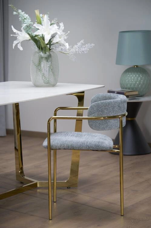 Dopełnieniem zestawu są cztery eleganckie krzesła tapicerowane tkaniną velvet, znaną ze swojej miękkości i delikatnego połysku. Ich ergonomiczny kształt i wygodne siedziska gwarantują komfort podczas długich spotkań przy stole, a złote nogi doskonale komponują się z konstrukcją stołu.