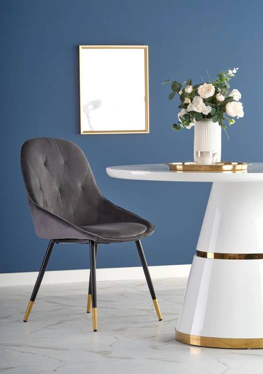 Komplet uzupełniają cztery eleganckie krzesła tapicerowane miękką tkaniną velvet, które doskonale wpisują się w estetykę zestawu. Ich złote nogi oraz aksamitna tapicerka tworzą harmonijną całość ze stołem, dodając wnętrzu klasy i wyjątkowego uroku. Ergonomiczny kształt oparcia oraz miękkie siedzisko zapewniają wysoki komfort użytkowania, a wysokiej jakości materiały gwarantują trwałość i odporność na codzienne użytkowanie.