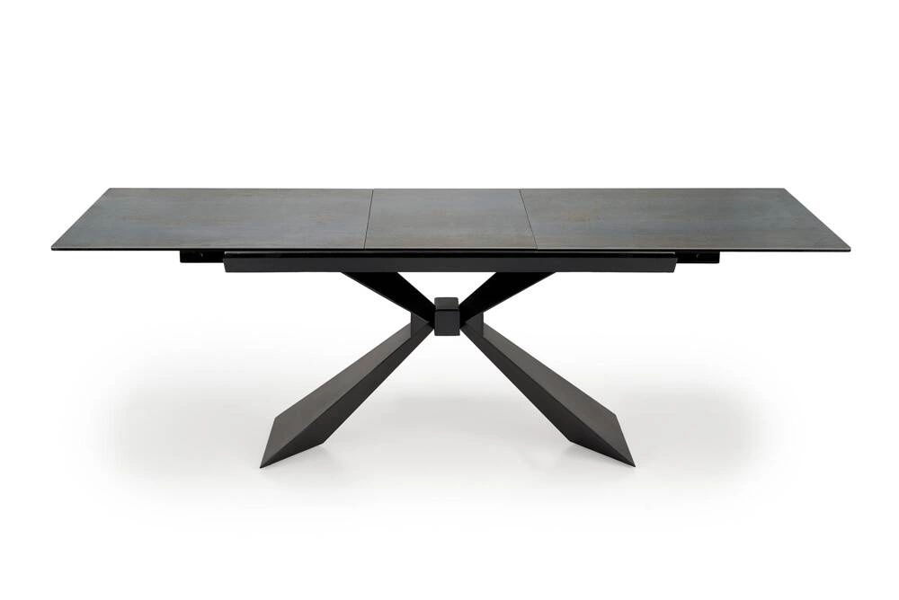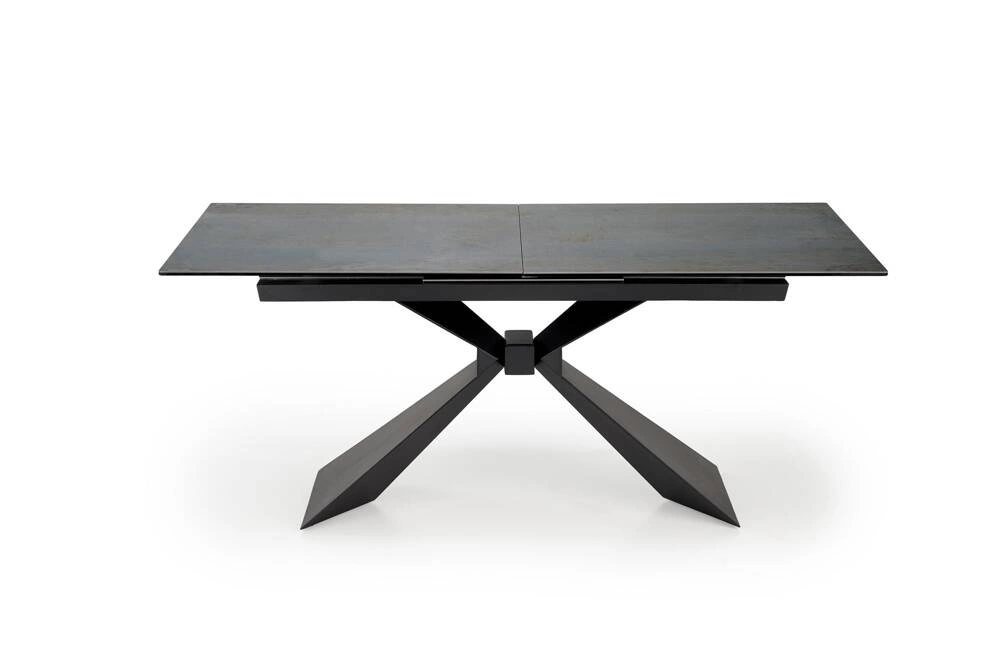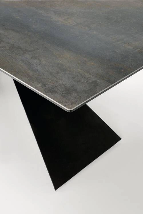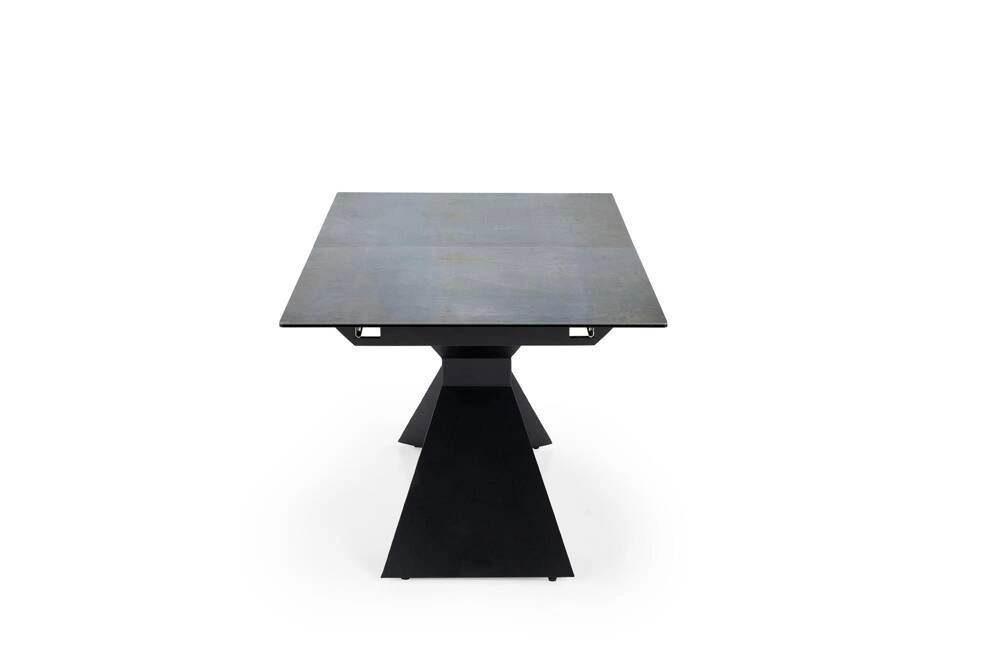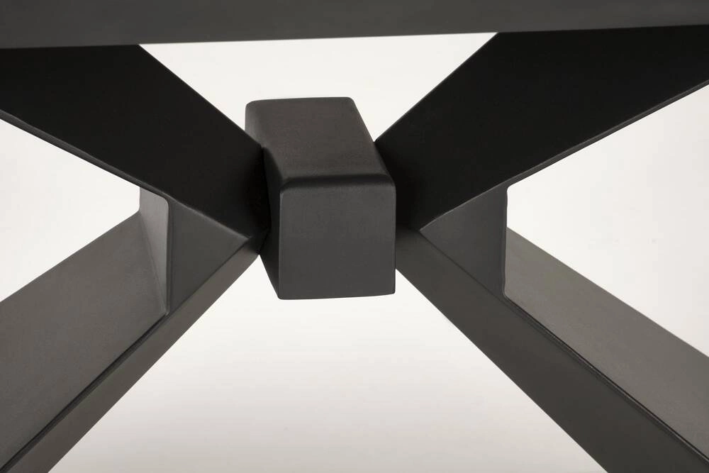 Stół LUCIANO wyróżnia się blatem w kolorze niebieskiego marmuru, który jest wykonany z ceramiki i szkła. Jego elegancka powierzchnia imituje naturalny kamień, nadając meblowi luksusowy i nowoczesny wygląd. Nogi stołu wykonane są z malowanej proszkowo stali w kolorze czarnym, co zapewnia stabilność i trwałość konstrukcji.