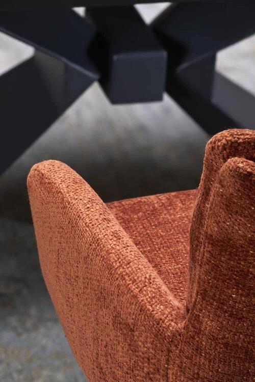 Uzupełnieniem stołu są cztery krzesła K540 w kolorze cynamonowym, które doskonale kontrastują z chłodnym odcieniem blatu, wprowadzając do wnętrza przytulność i ciepło. Tapicerowane miękką i trwałą tkaniną HAGA, oferują wysoki komfort użytkowania oraz elegancki wygląd. Ich subtelnie pikowane oparcie i ergonomiczna forma zapewniają doskonałe wsparcie dla pleców, a funkcja obrotu 360° zwiększa wygodę i funkcjonalność codziennego użytkowania. Solidne, czarne stalowe nogi gwarantują stabilność i doskonale komponują się z podstawą stołu.