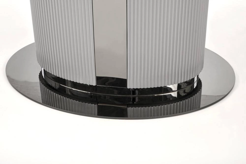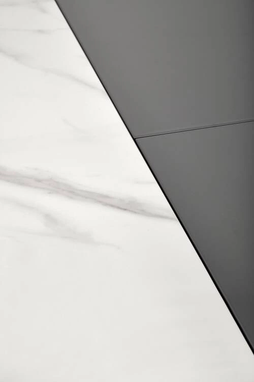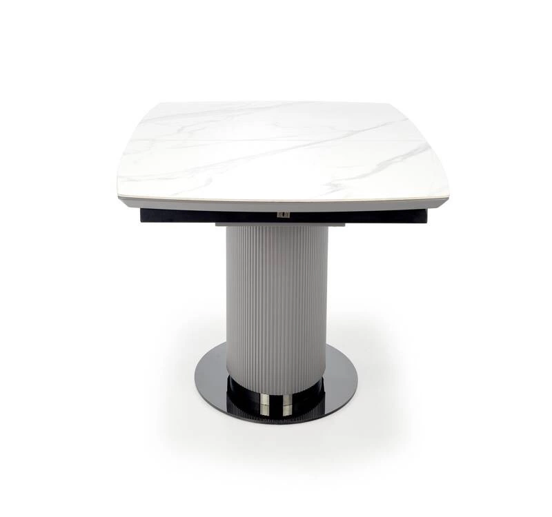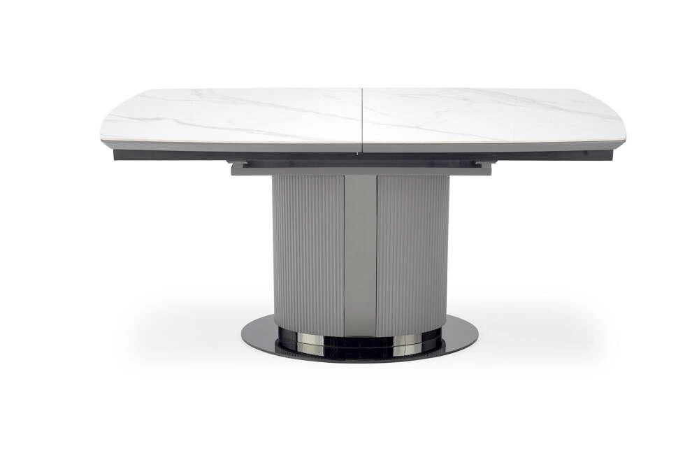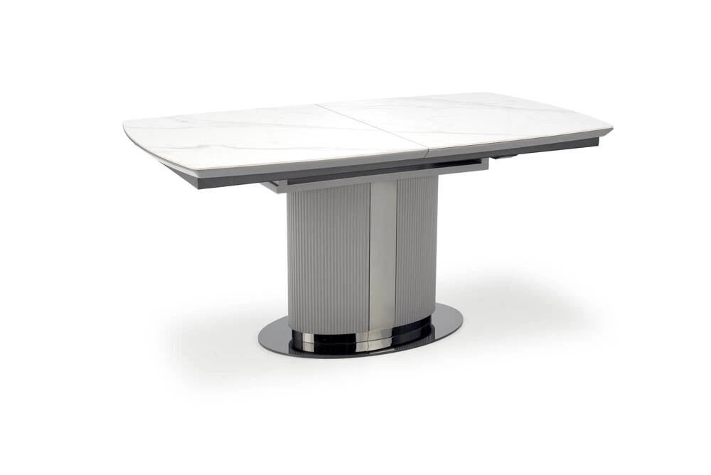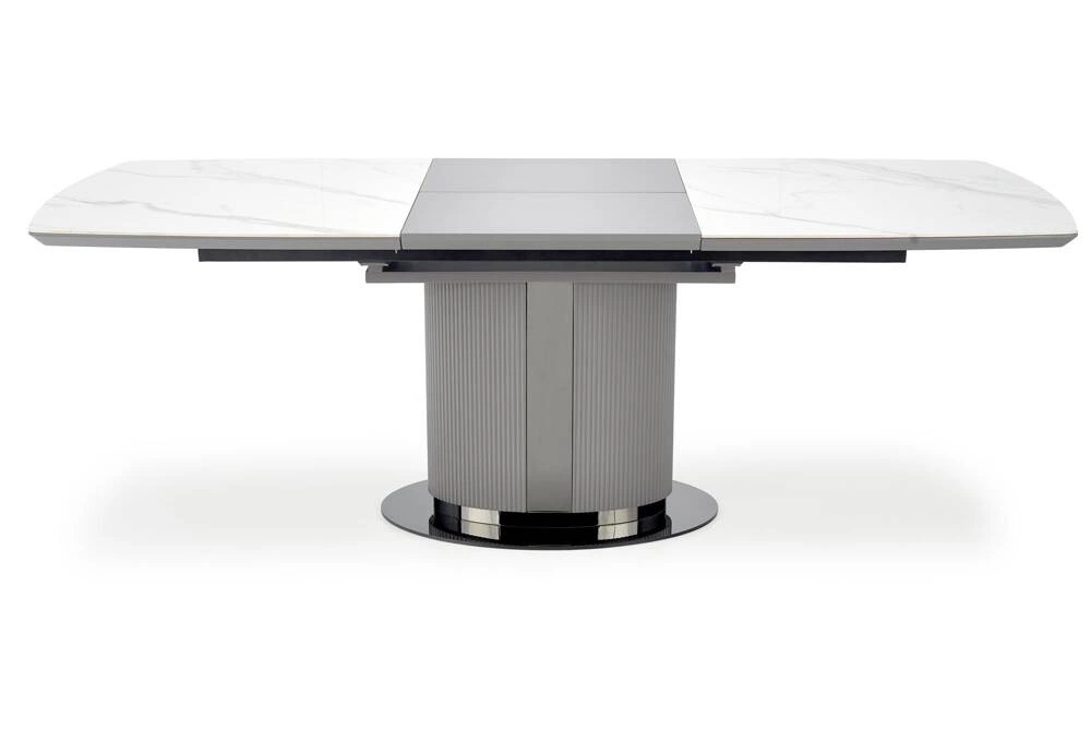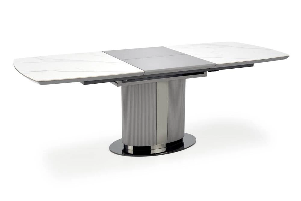 Blat stołu wykonany jest z ceramiki w kolorze białego marmuru, co nadaje mu elegancki i luksusowy wygląd. Noga stołu wykonana z lakierowanego MDF w kolorze popielatym oraz jasnym popielatym, w połączeniu z czarnymi akcentami, dodaje mu nowoczesnego charakteru i zapewnia stabilność. Stół DANCAN jest rozkładany, dzięki czemu można go łatwo dostosować do różnych potrzeb i liczby gości.