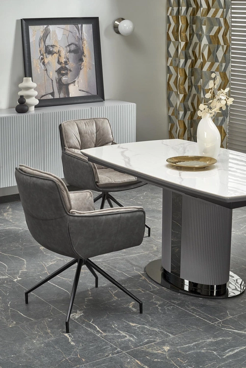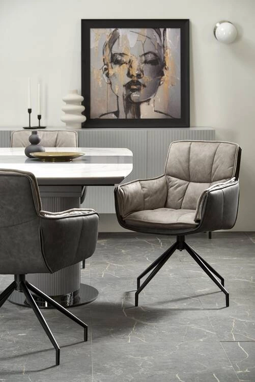 Dopełnieniem zestawu są cztery krzesła K523 w odcieniach popielu, które zapewniają nie tylko wyjątkowy komfort, ale i spójność stylistyczną z designem stołu. Ich tapicerka wykonana z połączenia tkaniny i eko skóry prezentuje się elegancko i nowocześnie, a subtelne pikowanie oparcia dodaje całości wyrafinowanego charakteru. Krzesła wyposażono w funkcję obrotu 360°, co znacząco zwiększa wygodę użytkowania. Stabilna konstrukcja ze stali malowanej proszkowo gwarantuje trwałość i niezawodność przez lata.